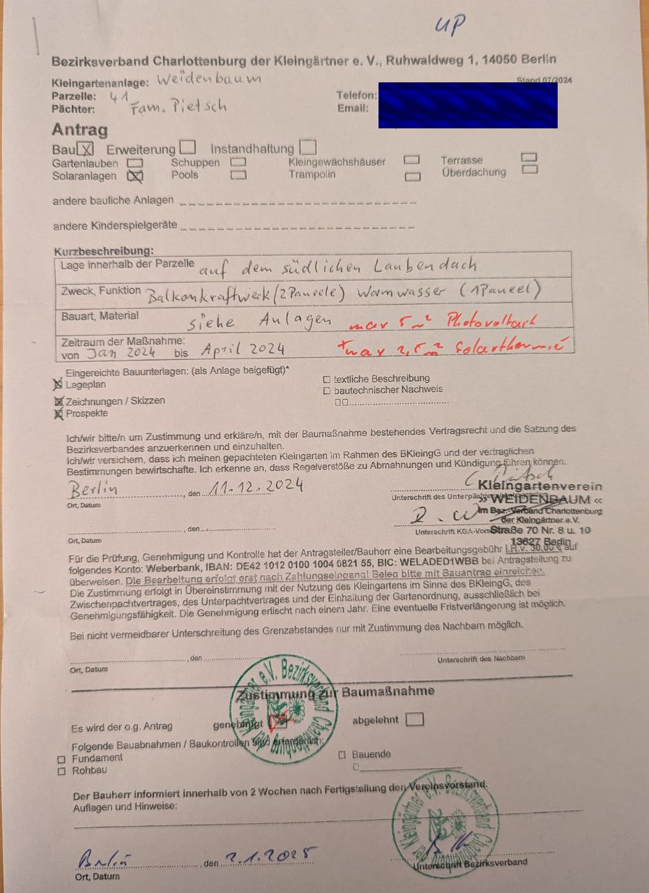 Der Bezirksverband hat eine recht genaue Vorstellung, was erlaubt ist: bis 5m² Photovoltaik mit 800Watt maximaler Leistungsabgabe ins Netz und zusätzlich bis 2,5m² Solarthermie. Die Art der Solarthermie ist nicht näher beschrieben, unter „die Anlage“ stelle ich meine Lösung vor. Dazu bekommt man dieses „Merkblatt“ ausgehändigt. Wie man sieht, ist die Info nicht mehr ganz taufrisch, aber auf weitere rechtliche Recherchen hatte ich keine Lust: